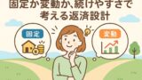 理由 → 投資は「良い年」と「悪い年」の平均で続きます。比率が高い=悪い時の打撃が大きい。金利の選び方でも継続性は変わるので、固定か変動かは続けやすさ”基準”で検討を